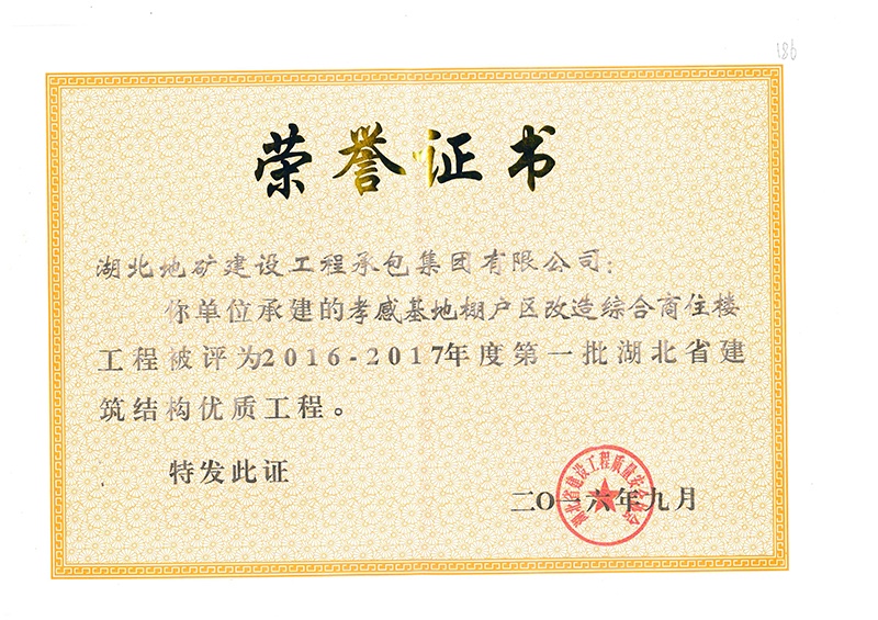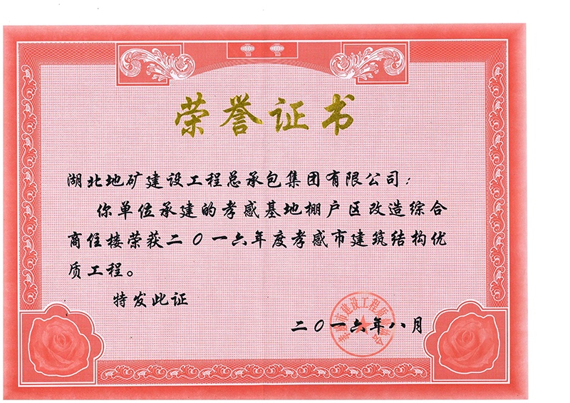 孝感項(xiàng)目獲得孝感市建筑工程優(yōu)質(zhì)結(jié)構(gòu)