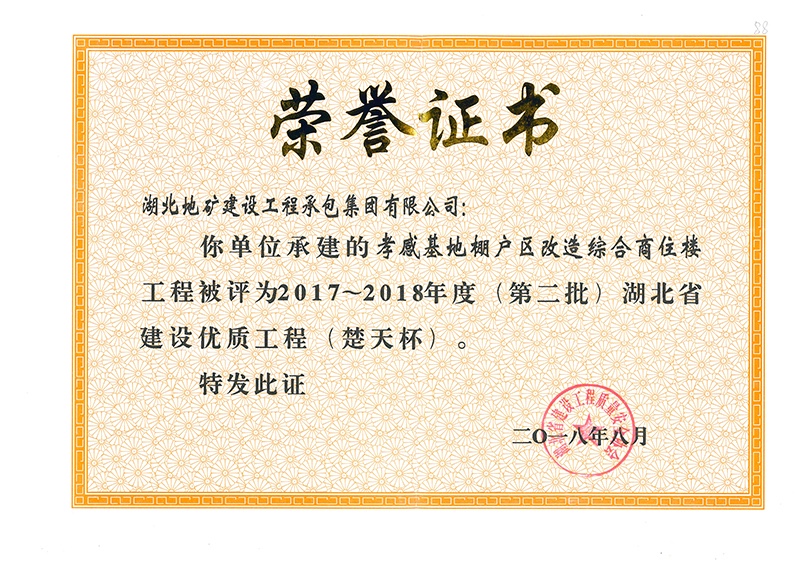 孝感棚戶區(qū)改造項(xiàng)目楚天杯獎(jiǎng)狀