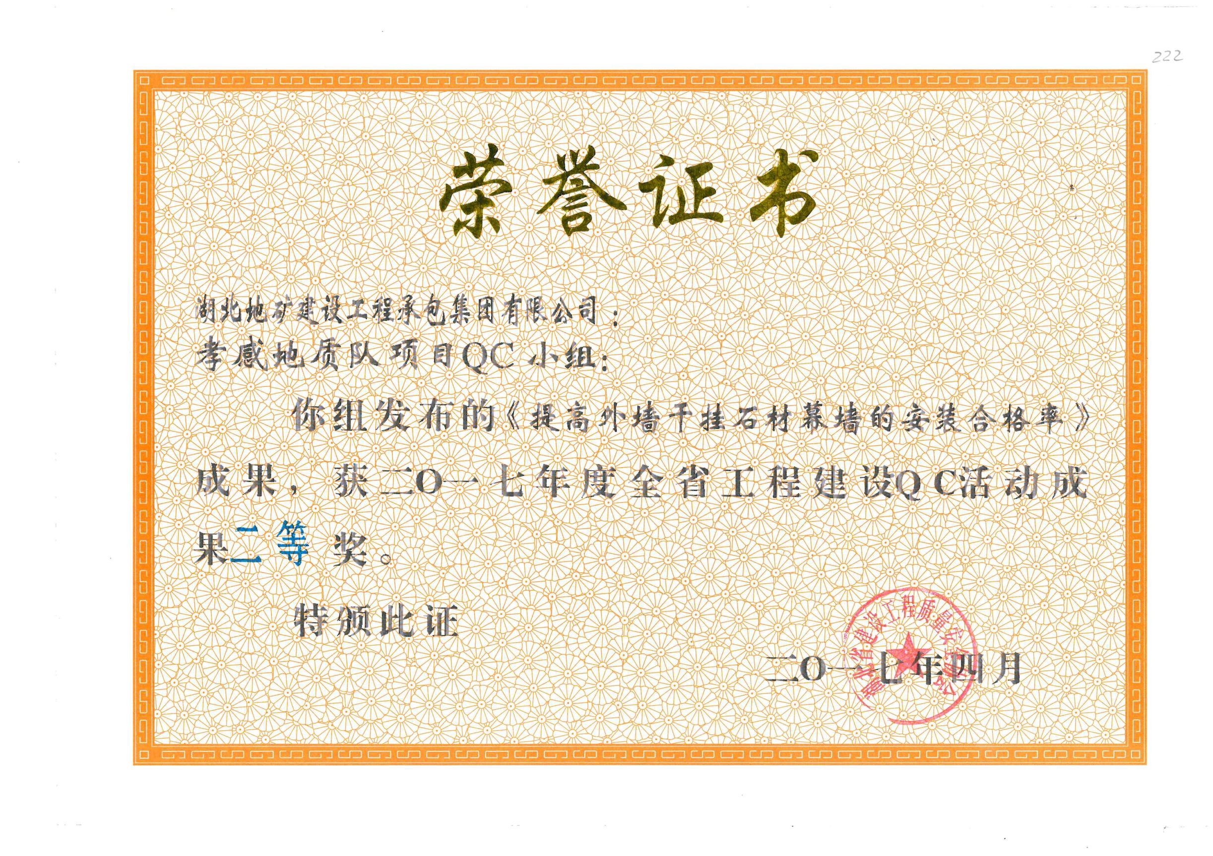 孝感棚改項(xiàng)目《提高外墻干掛石材幕墻的安裝合格率》獲QC成果二等獎(jiǎng)