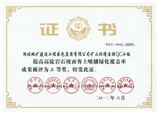 勘察公司選送的礦山環(huán)境治理QC小組《提高高陡巖石坡面客土噴播綠化覆蓋率》成果被評為三等獎,礦山環(huán)境治理QC小組被評為“優(yōu)秀質(zhì)量管理小組”。