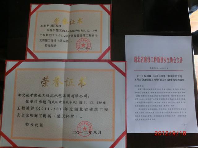 作為地建承包公司的一個(gè)文明施工窗口,該工程項(xiàng)目部通過(guò)良好的管理、有效的措施和科學(xué)合理的施工安排滿(mǎn)足了文明施工、環(huán)境保護(hù)、現(xiàn)場(chǎng)安全防護(hù)、擾民控制、材料設(shè)備進(jìn)出場(chǎng)以及政府部門(mén)對(duì)施工管理的相關(guān)要求,接受了來(lái)自建設(shè)、施工、監(jiān)理、政府等部門(mén)對(duì)項(xiàng)目現(xiàn)場(chǎng)進(jìn)行的全方位考評(píng),得到了各方好評(píng),并最終獲得了這項(xiàng)湖北省建筑行業(yè)安全文明施工的最高榮譽(yù)。