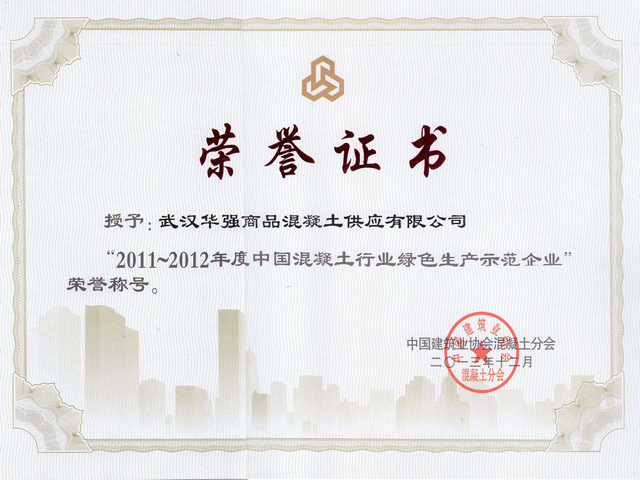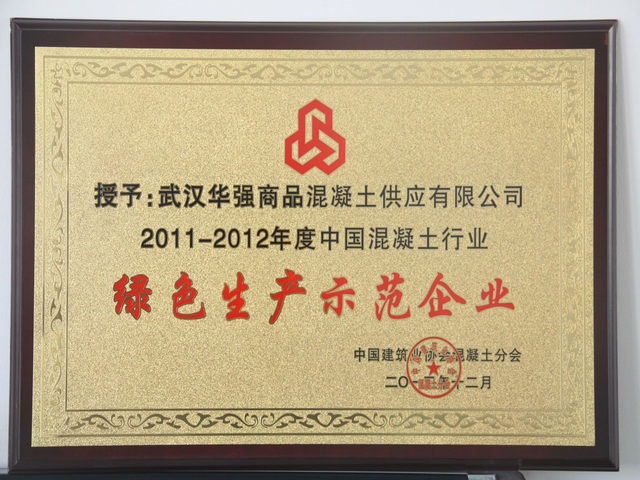 日前,2013年中國混凝土年會暨中國混凝土行業(yè)綠色生產(chǎn)示范企業(yè)表彰及經(jīng)驗交流會在深圳召開。湖北地建·華強公司被授予“2011~2012年度中國混凝土行業(yè)綠色生產(chǎn)示范企業(yè)”榮譽稱號。