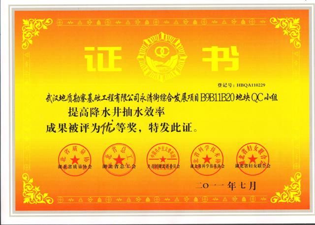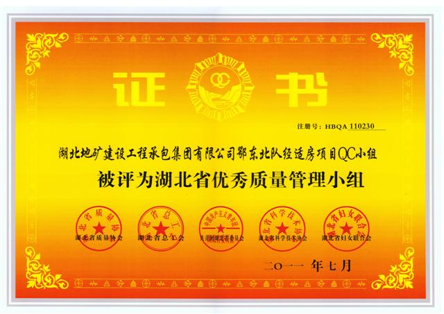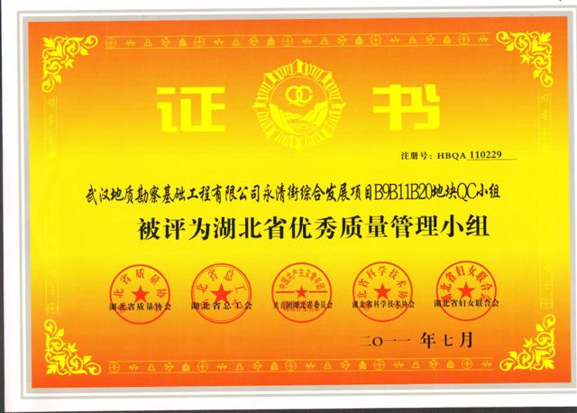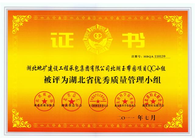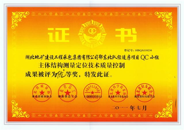 湖北地礦建設(shè)工程承包集團(tuán)有限公司QC成果《主體結(jié)構(gòu)測(cè)量定位技術(shù)質(zhì)量控制》、《降低框架結(jié)構(gòu)外墻抹灰開(kāi)裂空鼓率》和武基公司QC成果《提高降水井抽水效率》均被大會(huì)評(píng)為優(yōu)等獎(jiǎng),承包公司鄂東北隊(duì)經(jīng)適房項(xiàng)目QC小組、北湖玉帶園項(xiàng)目QC小組和武基公司永清街綜合發(fā)展項(xiàng)B9B11B20地塊QC小組榮獲“湖北省優(yōu)秀質(zhì)量管理小組”稱(chēng)號(hào)。