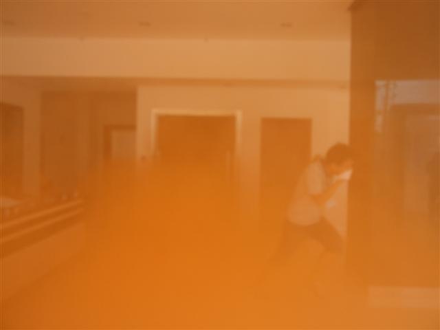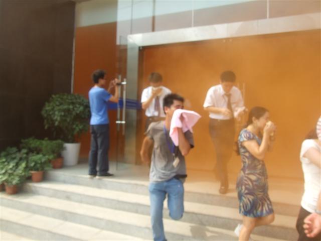 15時30分,演練活動正式開始,地建大樓二樓和六樓發(fā)生“火災(zāi)”,頃刻間濃煙滾滾,火勢迅速蔓延,有形成立體燃燒之勢。演練總指揮程立文同志在聽取了警報組人員匯報的火情后,立即宣布啟動地建大樓消防疏散逃生應(yīng)急預(yù)案。霎時,警笛大作,相互提醒聲、疏散指導聲不斷。救援人員抬著“傷員”、攙扶弱者忙而有序;逃生人員濕巾掩鼻、低頭彎腰、手摸通道墻壁順勢而下,慌而不亂。不到10分鐘,所有人員安全撤到集合地點。