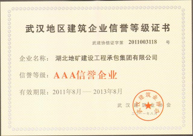 2011年8月26日,武漢建筑業(yè)協(xié)會公布了2011年武漢地區(qū)建筑業(yè)企業(yè)信譽等級評定結果,湖北地礦建設工程承包集團有限公司再次被評為“武漢地區(qū)建筑業(yè)AAA級信譽企業(yè)”。