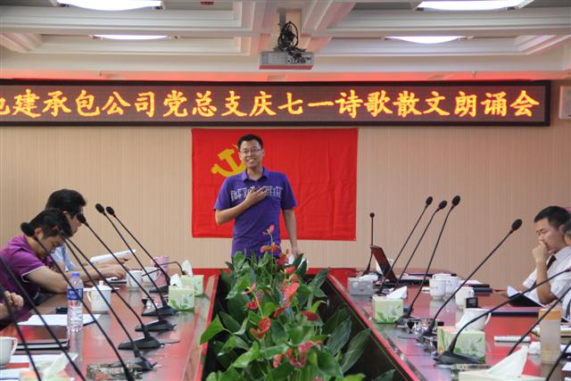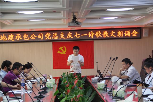 為了慶祝建黨91周年,地建承包公司黨總支于6月29日下午在公司13樓會議室成功舉行了“迎七一”詩歌散文朗誦會。院黨委委員、副院長史立京和地建承包公司50余名機(jī)關(guān)工作人員、黨員參加了朗誦會。