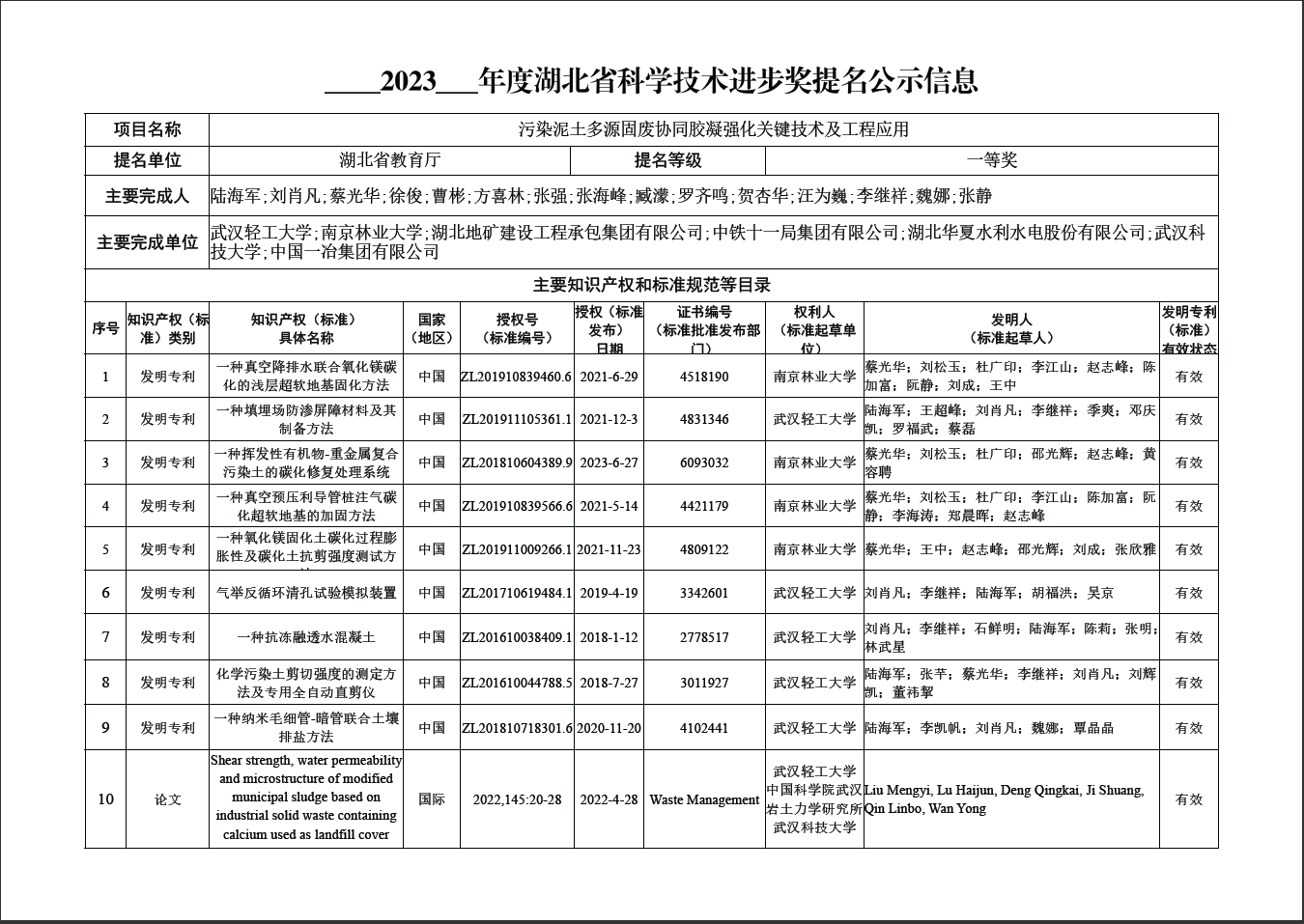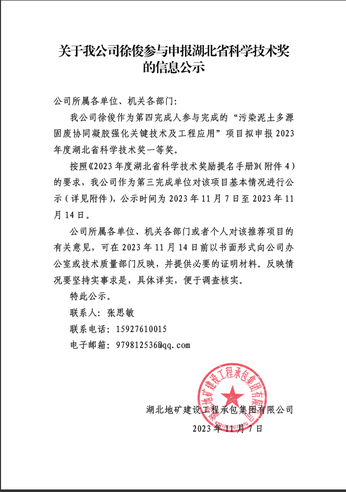 關(guān)于我公司徐俊參與申報(bào)湖北省科學(xué)技術(shù)獎(jiǎng)的信息公示