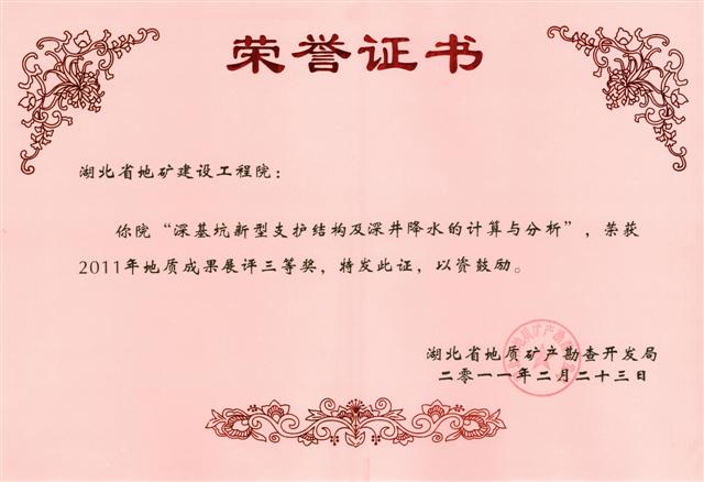 全局34項(xiàng)地質(zhì)成果參加了地質(zhì)成果展評, 29項(xiàng)成果參加評選,(包括工程院選送的“湖北省工程建設(shè)工法的開發(fā)”成果在內(nèi)的5項(xiàng)成果因近兩年在省局或省廳獲過獎(jiǎng)而不參加本次評獎(jiǎng)),共評出壹等獎(jiǎng)2項(xiàng),貳等獎(jiǎng)4項(xiàng),叁等獎(jiǎng)8項(xiàng)。由工程院選送的“新型基礎(chǔ)工程施工工藝研究”成果榮獲貳等獎(jiǎng),“深基坑新型支護(hù)結(jié)構(gòu)及深井降水的計(jì)算與分析” 成果榮獲叁等獎(jiǎng)。