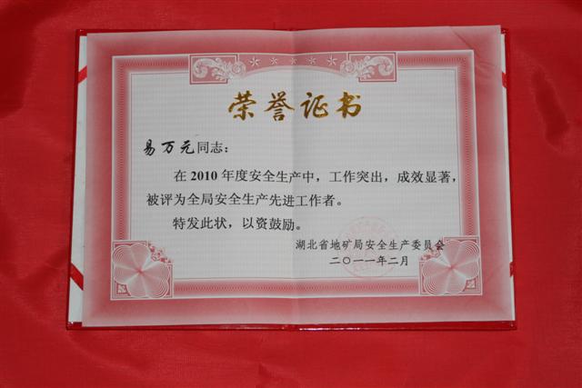 2011年3月4日,省地礦局召開 2011年安全生產(chǎn)工作會(huì)議。會(huì)議對(duì)省、局安全生產(chǎn)先進(jìn)單位和個(gè)人進(jìn)行了獎(jiǎng)勵(lì)。武基公司榮獲“省地礦局2010年度安全生產(chǎn)先進(jìn)單位”,公司總經(jīng)理易萬(wàn)元被評(píng)為“省地礦局安全生產(chǎn)先進(jìn)工作者”,獲“全省安全生產(chǎn)先進(jìn)工作者”稱號(hào)的武基公司安全科長(zhǎng)趙宏偉還以《履行安全生產(chǎn)管理職責(zé),做一名合格的安全生產(chǎn)“守衛(wèi)者”》為題在大會(huì)上作了安全工作經(jīng)驗(yàn)交流。