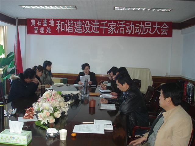 2011年3月25日下午,黃石基地管理處召開了“和諧建設(shè)進千家”活動動員大會。會議以“訪民情、辦實事、化矛盾、促和諧”為主題;以結(jié)合職工實際、圍繞職工群眾最關(guān)心、最直接、最現(xiàn)實的利益問題,努力為職工群眾多辦解民憂、謀民利、化民怨的實事好事為宗旨;圍繞促進和諧基地建設(shè),大力開展“送政策、送健康、送服務(wù)、送溫暖”等活動,通過走訪慰問,把黨的關(guān)懷與溫暖送到職工群眾手中。該活動分3個工作小組,將分別走訪四個小區(qū),從