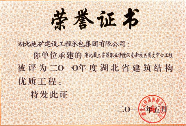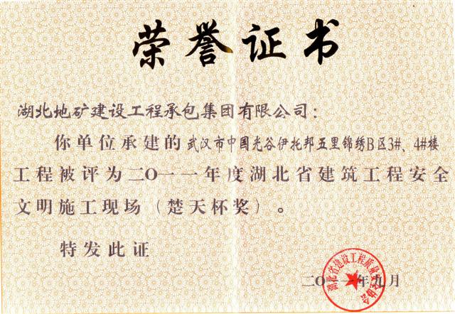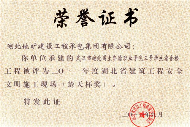 據(jù)悉,“安全文明施工現(xiàn)場(楚天杯)”獎是湖北省建筑行業(yè)安全文明施工的最高榮譽獎項,目的在于鼓勵建筑施工企業(yè)搞好安全文明施工,提高全省建筑施工安全生產(chǎn)水平。該獎項的評定是從建設(shè)、施工、監(jiān)理等方面,對項目現(xiàn)場進行全方位考評。 另訊,日前收到湖北省住房和城鄉(xiāng)建設(shè)廳文件《關(guān)于公布2010-2011年度第一批湖北省建筑結(jié)構(gòu)優(yōu)質(zhì)工程名單的通知》(鄂建文〔2011〕61號),地建承包公司承建的湖北國土資源職業(yè)學(xué)院漢南新校區(qū)圖文中心工程和鄂東北地質(zhì)大隊孝感基地經(jīng)濟適用房工程名列其中。