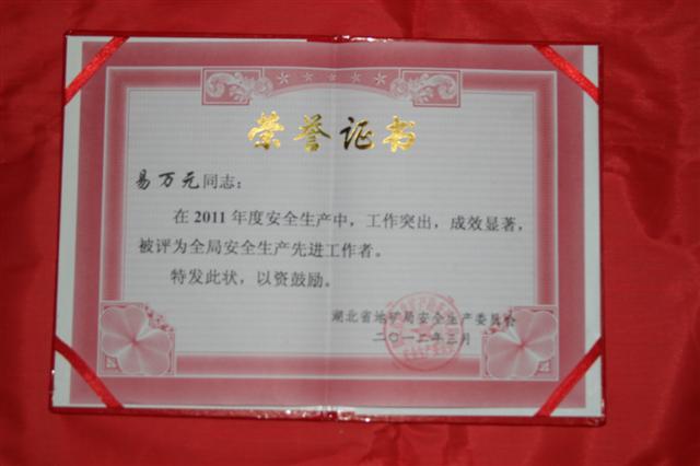 2011年度,武基公司積極推行安全標(biāo)準(zhǔn)化管理,安全生產(chǎn)工作取得了較好的成績。3月16日,在湖北省地礦局2012年度安全工作會(huì)議上,公司被授予“2011年度湖北省地礦局安全生產(chǎn)先進(jìn)單位” 榮譽(yù)稱號(hào),公司總經(jīng)理易萬元同志被授予 “2011年度湖北省地礦局安全生產(chǎn)先進(jìn)工作者”榮譽(yù)稱號(hào)。