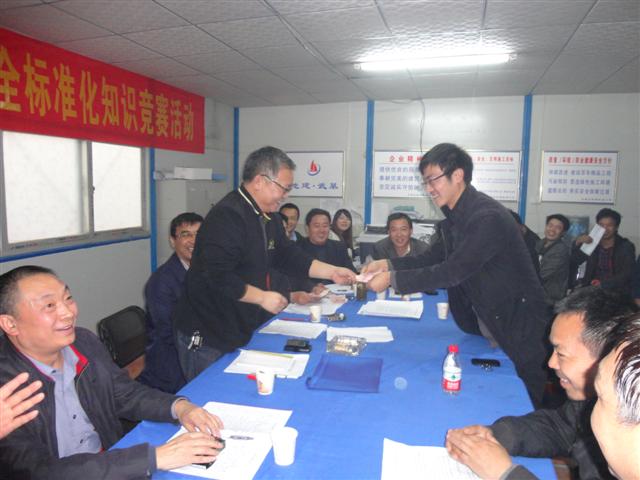 本次知識競賽活動共評出了一等獎1名,二等獎2名,三等獎3名,鼓勵獎6名,公司領(lǐng)導(dǎo)和工程處領(lǐng)導(dǎo)為獲獎人員當(dāng)場頒發(fā)了獎金。 活動極大的提高了各項目人員學(xué)習(xí)安全標(biāo)準(zhǔn)化知識的積極性,增強了全員安全生產(chǎn)意識,為公司順利完成2012年安全標(biāo)準(zhǔn)化達標(biāo)創(chuàng)建工作打下了良好的基礎(chǔ)。